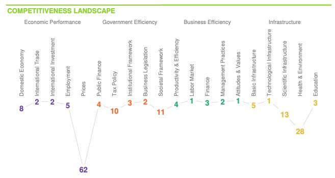 新加坡在總體生產(chǎn)率、熟練勞動力可用性、法規(guī)遵從性以及風險投資和銀行金融服務(wù)等九個領(lǐng)域排名第一。