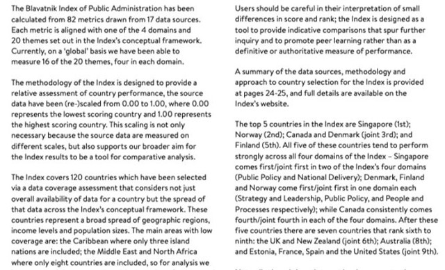 英國牛津大學的布拉瓦尼克政府學院于2024年12月5日公布了最新布拉瓦尼克公共行政指數(shù)報告(Blavatnik Index of Public Administration),比較了全球120個國家的公共管理部門。新加坡民事服務(wù)全球居冠。新加坡在邊境服務(wù)、稅務(wù)管理創(chuàng)新策略和實踐方面領(lǐng)先全球其他國家。