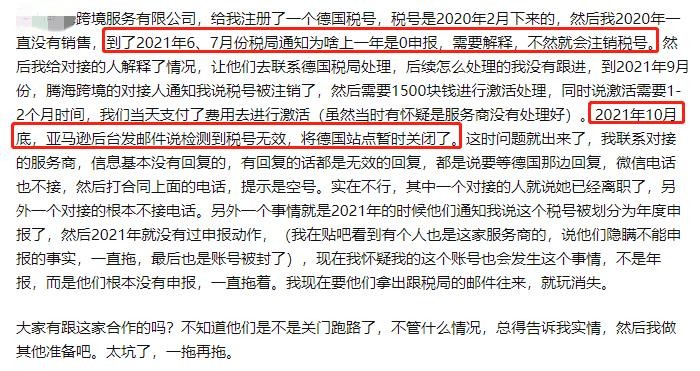 有賣家反映,去年在某家跨境服務(wù)公司辦理VAT業(yè)務(wù),從今年開始事情就開始不對勁,相關(guān)問題交錢后業(yè)務(wù)也處于停滯狀態(tài),業(yè)務(wù)人員既不回消息,也沒有任何通知,最后導(dǎo)致稅號檢測無效,站點(diǎn)被關(guān)閉!