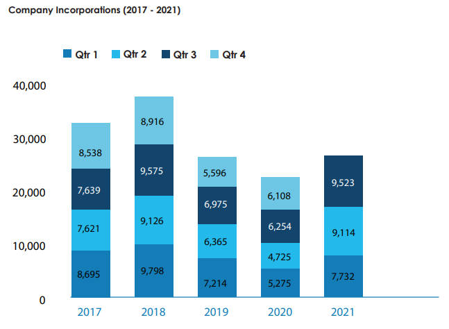 2021年第三季度,BVI公司注冊數(shù)量9523家,同比增長52.27%。