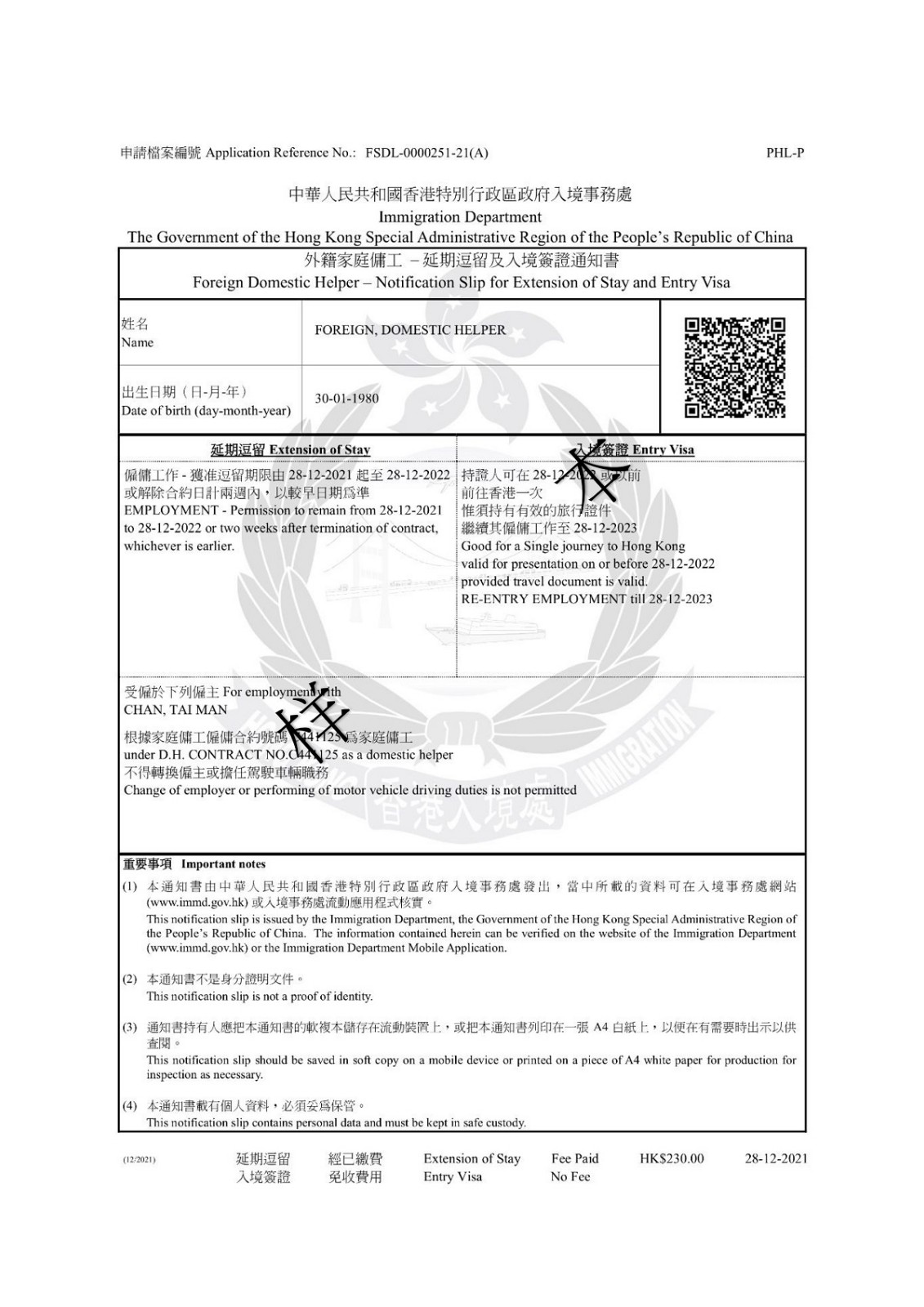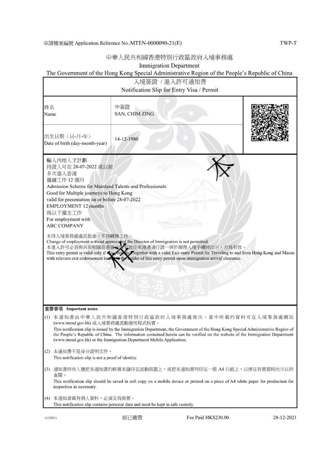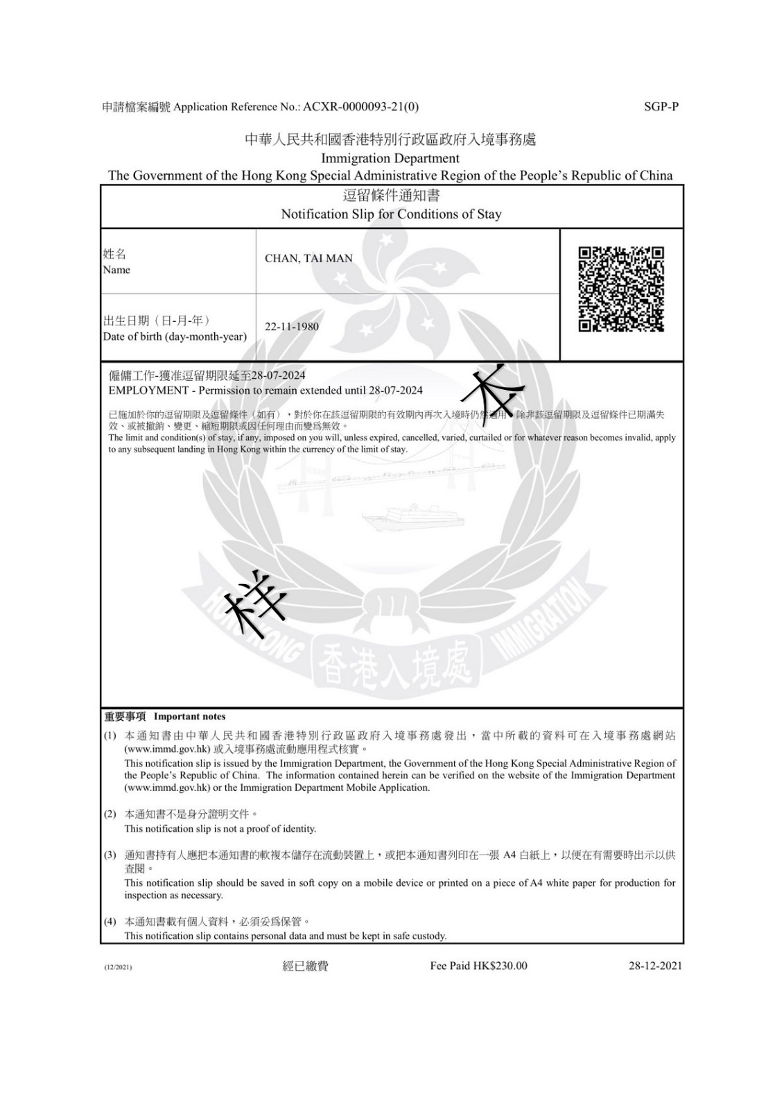 「電子簽證」載有加密二維碼供核實該證之用。有關(guān)人士(例如「電子簽證」持有人的準(zhǔn)雇主)可使用入境處流動應(yīng)用程式掃描該二維碼檢視相關(guān)資料。使用其他相機(jī)裝置或流動應(yīng)用程式掃描該二維碼將無法檢視相關(guān)資料。此外,有關(guān)人士亦可在香港政府一站通網(wǎng)站或入境處流動應(yīng)用程式(APP)輸入「電子簽證」資料,以核實該證。